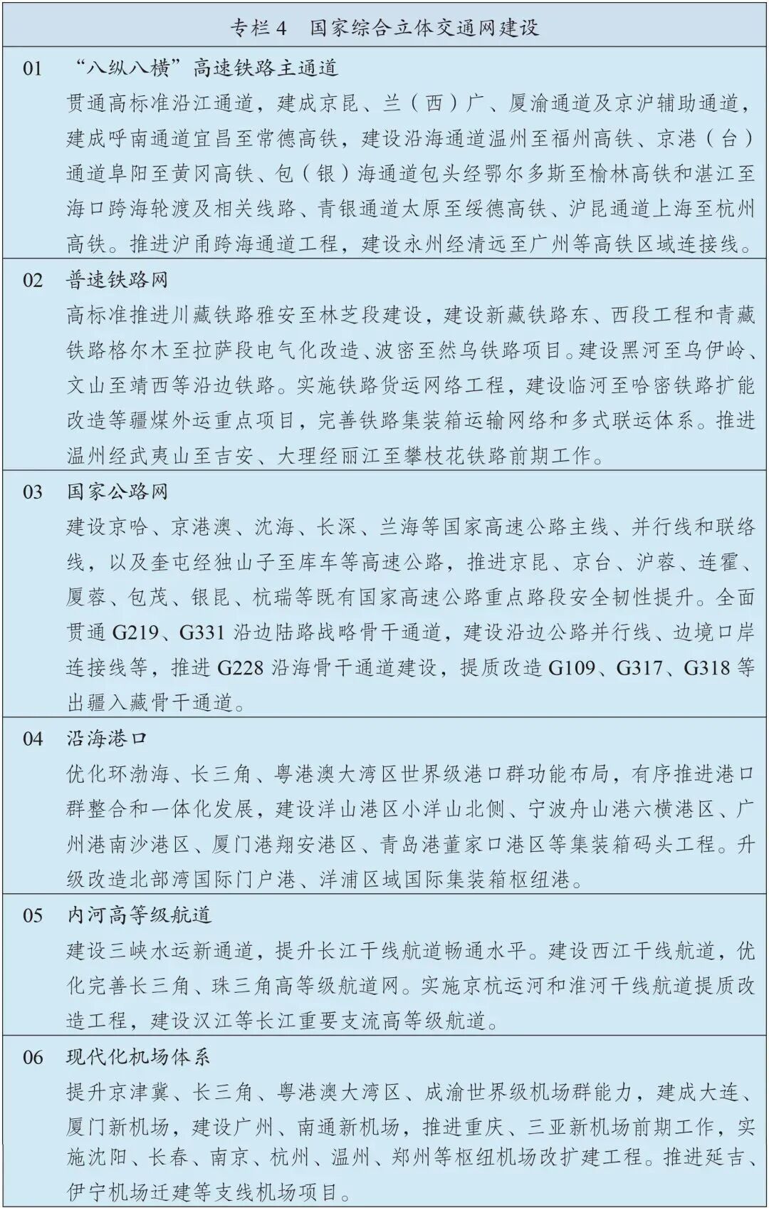完善国家综合立体交通网主骨架,高质量建设沿海沿边沿江、出疆入藏、西部陆海新通道等战略骨干通道,基本建成“八纵八横”高速铁路主通道和国家高速公路网,推进内河高等级航道提质升级,基本建成世界级港口群和机场群。